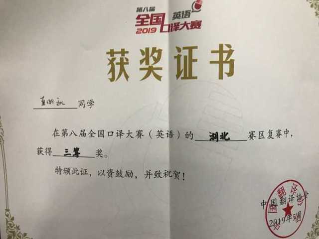 “中译杯”全国口译大赛(英语)由中国翻译协会举办,是国内最具影响力和最高规格的口译大赛。大赛已经连续在全国举办八届,吸引了国内数百所高校、数千人的口译精英参与。本次大赛共有来自武汉大学、华中科技大学等几十所高校的近两百名本科生﹑研究生选手参加,竞争十分激烈。