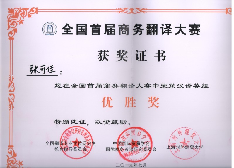 (通讯员:周志浩)7月7日,首届全国商务翻译大赛决赛在上海对外经贸大学松江校区举行,我系学子张可佳参加了此次决赛,并荣获优胜奖。张可佳从初赛10000余参赛者中脱颖而出,其中包括来自全国各高校研究生、本科生以及企业机构的翻译从业人员。