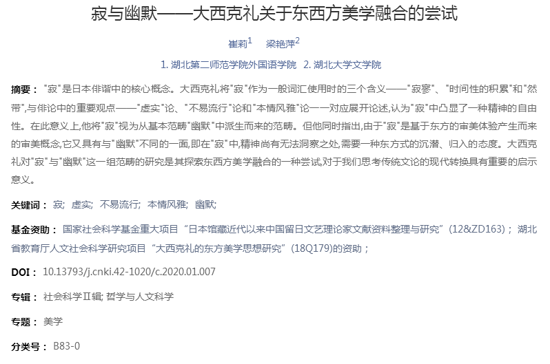 崔莉:《湖北大学学报(哲学社会科学版)》——寂与幽默——大西克礼关于东西方美学融合的尝试