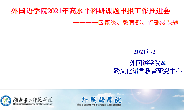 (通讯员 唐植君)2021年2月2日上午10点,借助腾讯会议线上交流平台,外国语学院召开2021年高水平科研课题申报工作推进会暨跨文化语言教育研究中心第一季度线上工作会议。外国语学院领导班子高度重视我院高水平科研课题申报工作,会前书记、院长们了解预申报总体情况,指导、部署工作,会议过程全程参与、鼓励外院教师积极参与科研工作。