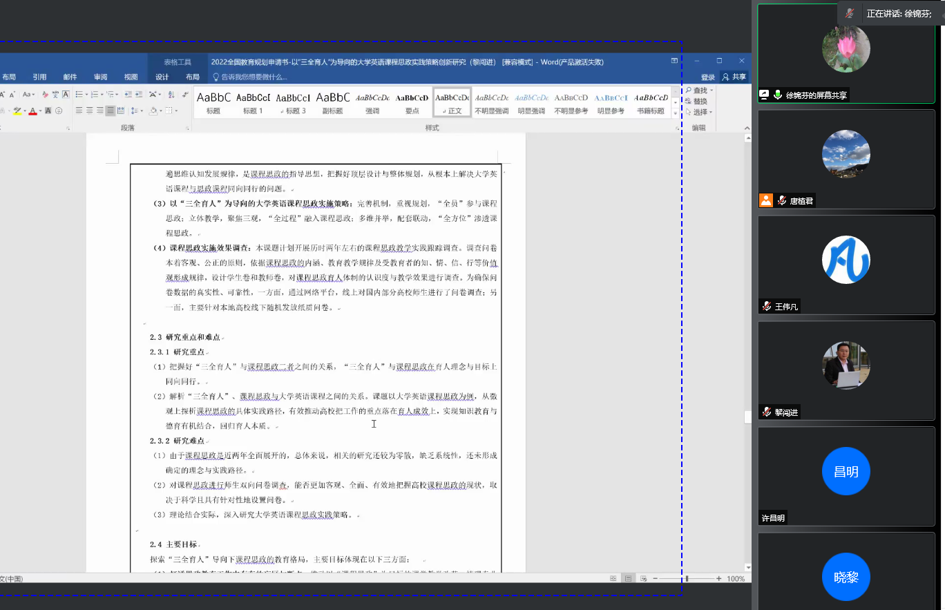 2022年3月3日晚20:30,应外国语学院邀请,在为全院教师进行科研课题申报讲座后,华中科技大学外国语学院徐锦芬教授参加了我院高层次课题申报交流会,指导我院申报2022年国家社科基金项目、教育部人文社科课题、国家教育规划课题的教师进行申报书修改。