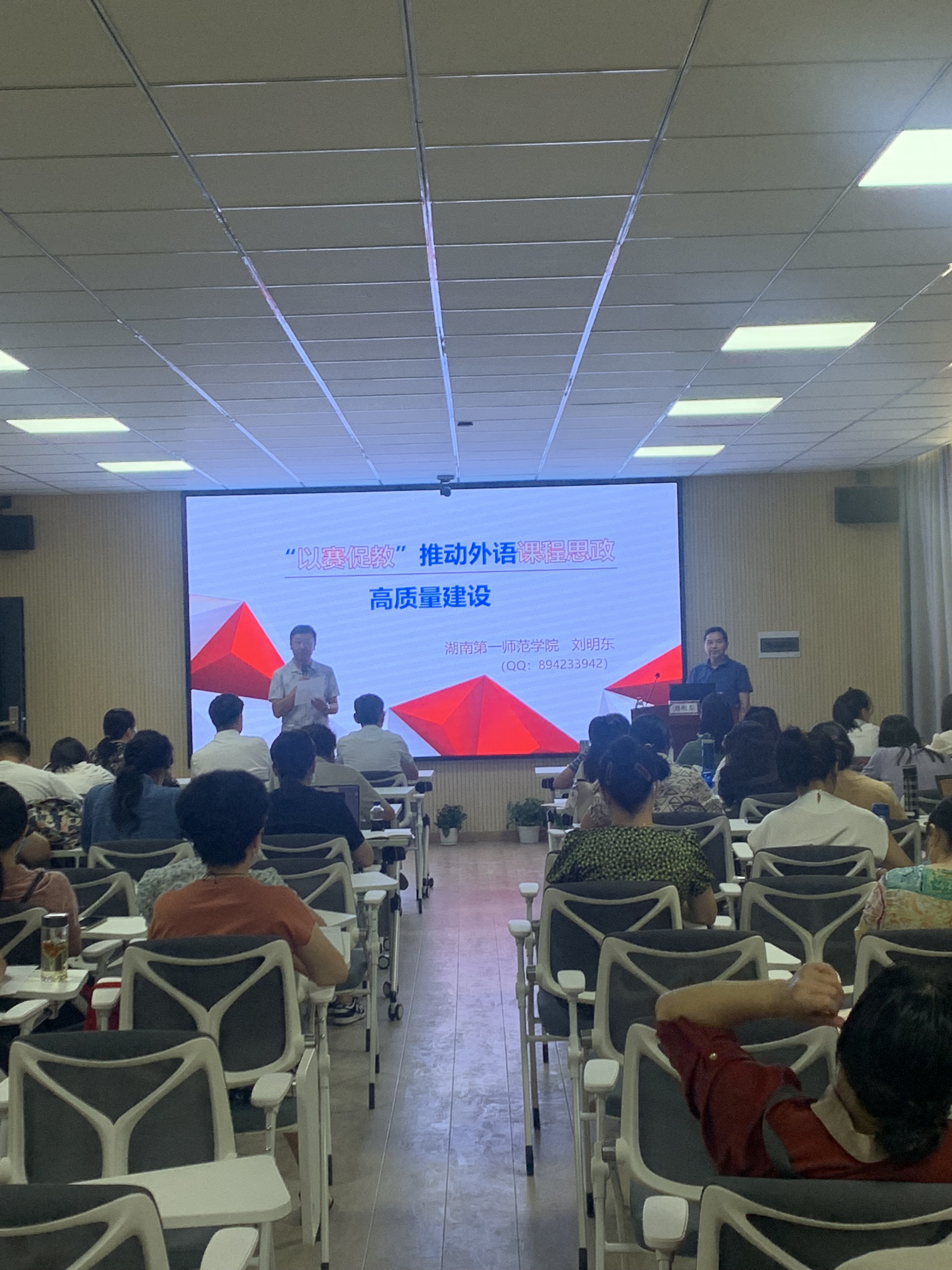 2022年9月15日,应外国语学院邀请,湖南第一师范学院刘明东教授来学院交流,为外院师生呈现了一场别开生面的外语课程思政与外语教师学术成长双重主题学术讲座。讲座在外国语学院三号楼多功能外语教学中心举行,由外国语学院院长刘晖主持,外国语学院全体教师及学院师范专业部分学生也参加了此次活动。