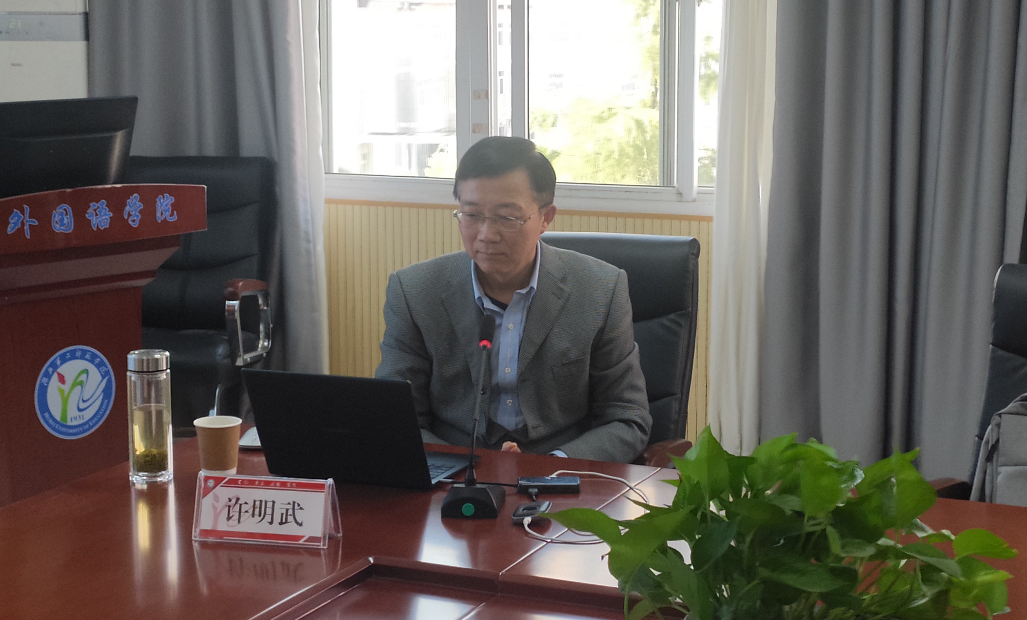 2023年3月14日下午3:30,外国语学院邀请华中科技大学外国语学院许明武教授,为学院2023年高层次课题申报及科研平台建设进行指导。外国语学院院长刘晖主持会议,学院党委书记胡崇芝、副院长冶慧颖、唐植君、学院教学及科研骨干教师20余人参加了此次指导会。