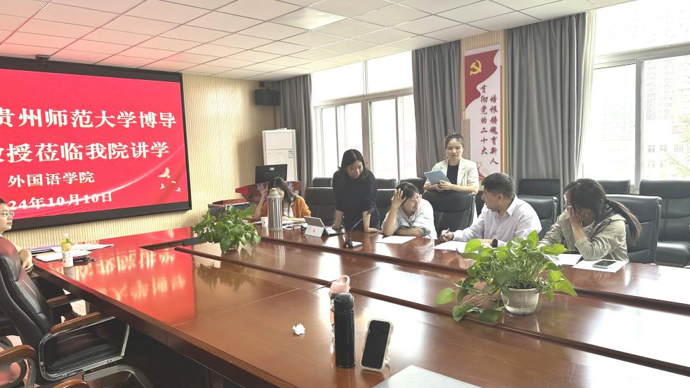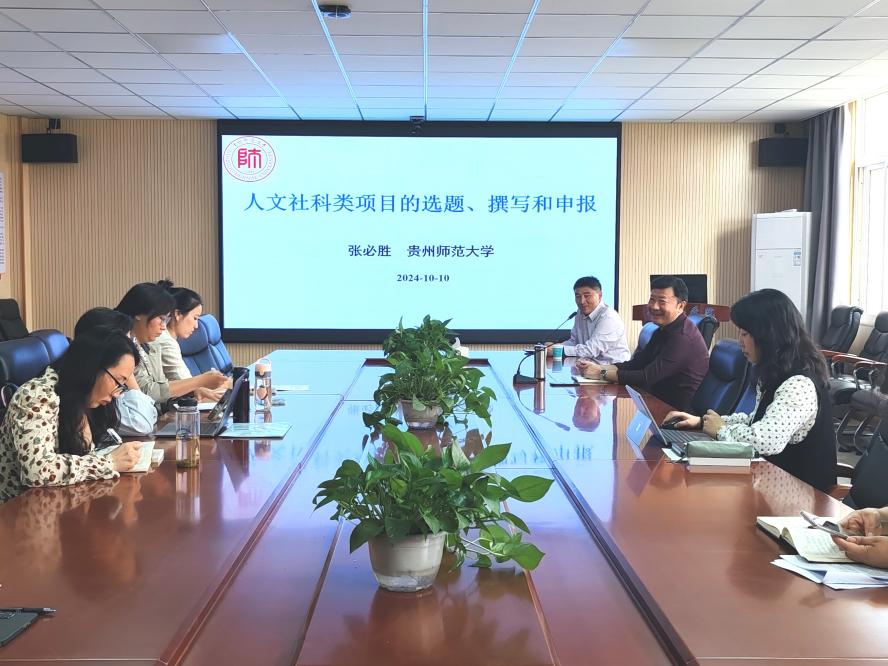 本网讯 2024年10月10日上午,外国语学院邀请贵州师范大学张必胜教授,在四楼会议室成功举办了主旨为“关于人文社科类项目选题、撰写与申报”学术专题讲座。会议由外国语学院刘晖院长主持,刘院长首先对张教授到来表示热烈欢迎,向在座教师介绍了张教授丰富的学术经历与成果,外国语学院相关课题申报教师参加了此次讲座。